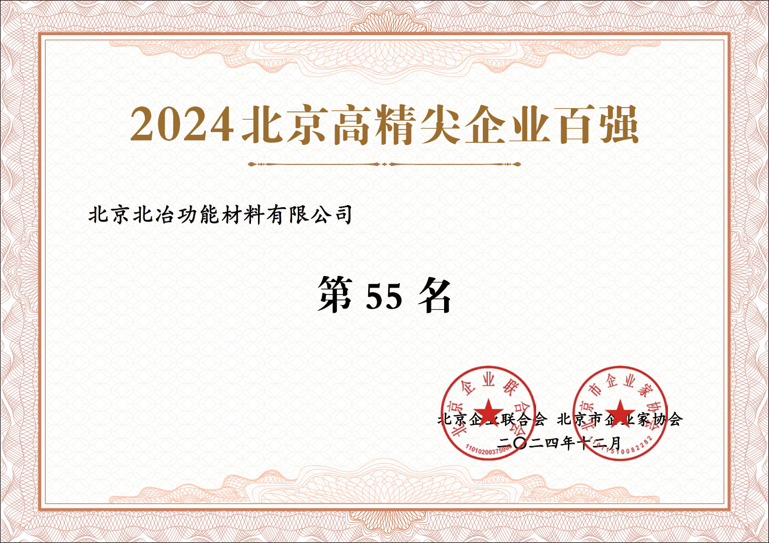 近日,北京企業(yè)聯(lián)合會、北京市企業(yè)家協(xié)會公布2024年北京企業(yè)百強(qiáng),北冶公司憑借在營業(yè)能力、研發(fā)水平、納稅貢獻(xiàn)等方面的優(yōu)異表現(xiàn)連續(xù)三年入選“北京高精尖企業(yè)百強(qiáng)”,排名55位;同時連續(xù)兩年上榜2023年新設(shè)立的“北京專精特新企業(yè)百強(qiáng)”,排名20位。