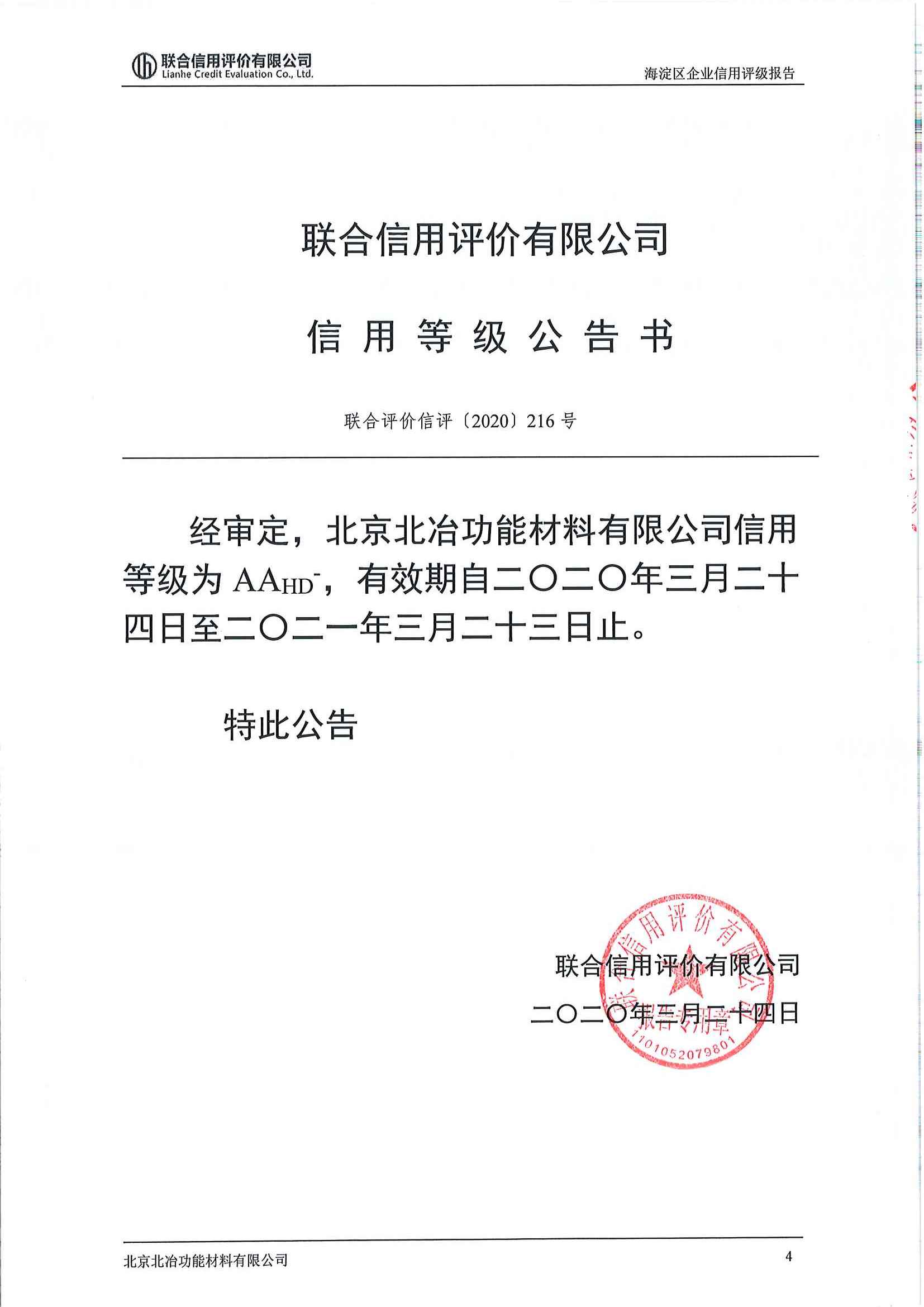 4月1日,北京聯(lián)合信用評價有限公司基于對北京北冶功能材料有限公司所處行業(yè)環(huán)境、運營與管理、財務(wù)狀況等多方面因素進行分析,評定其信用等級為AA。
